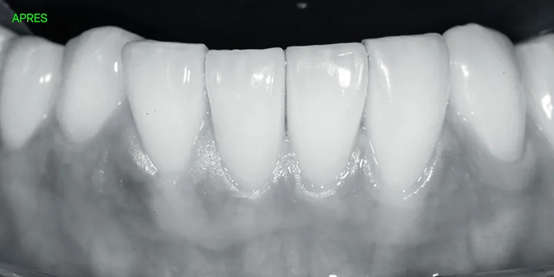 Cette étape du traitement permet d’installer sur les dents non préparées le mock up : c’est une phase importante car elle permet au patient d’avoir une pré visualisation du résultat final à partir d’un projet esthétique conçu soit artisanalement soit numériquement au laboratoire de prothèse.
